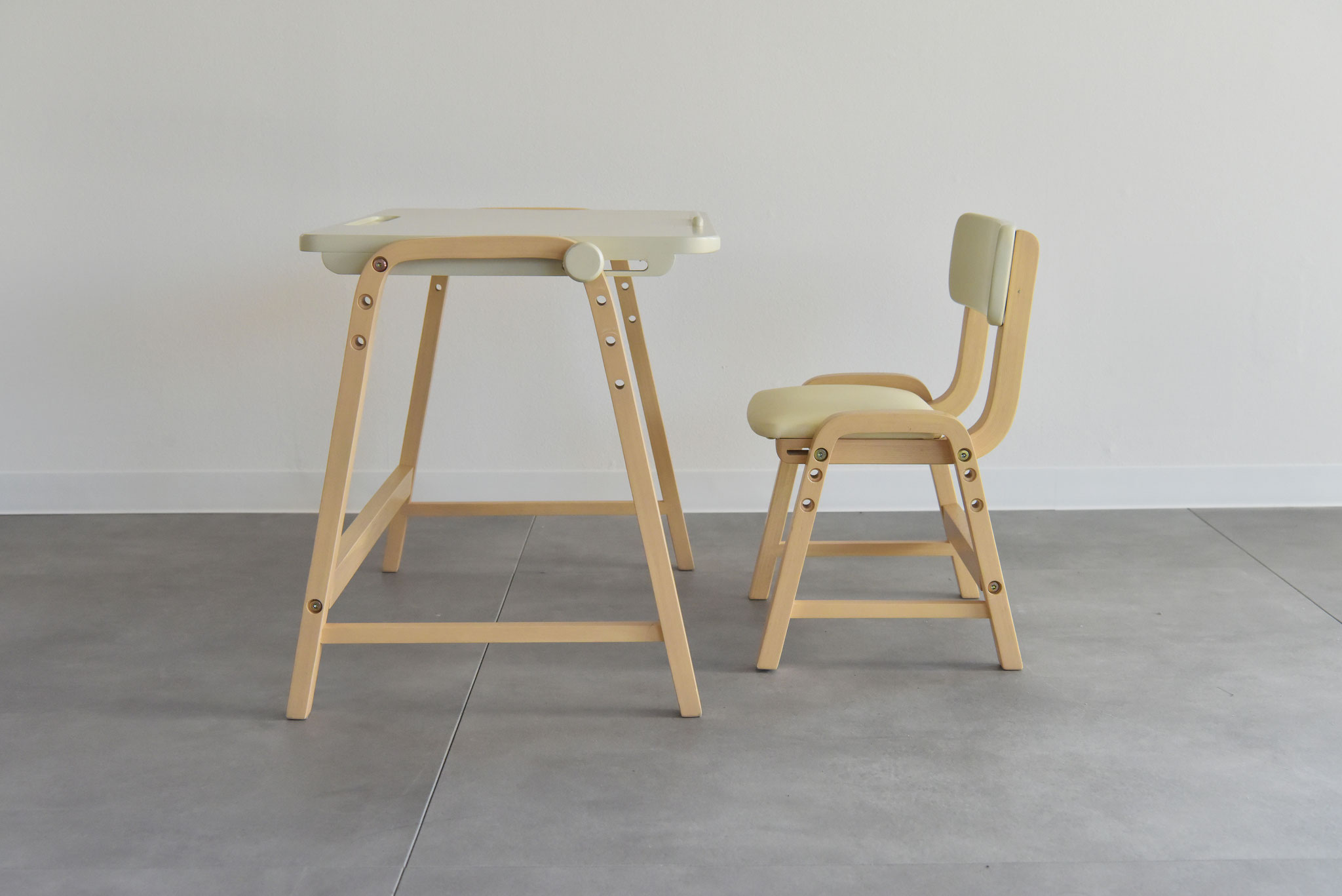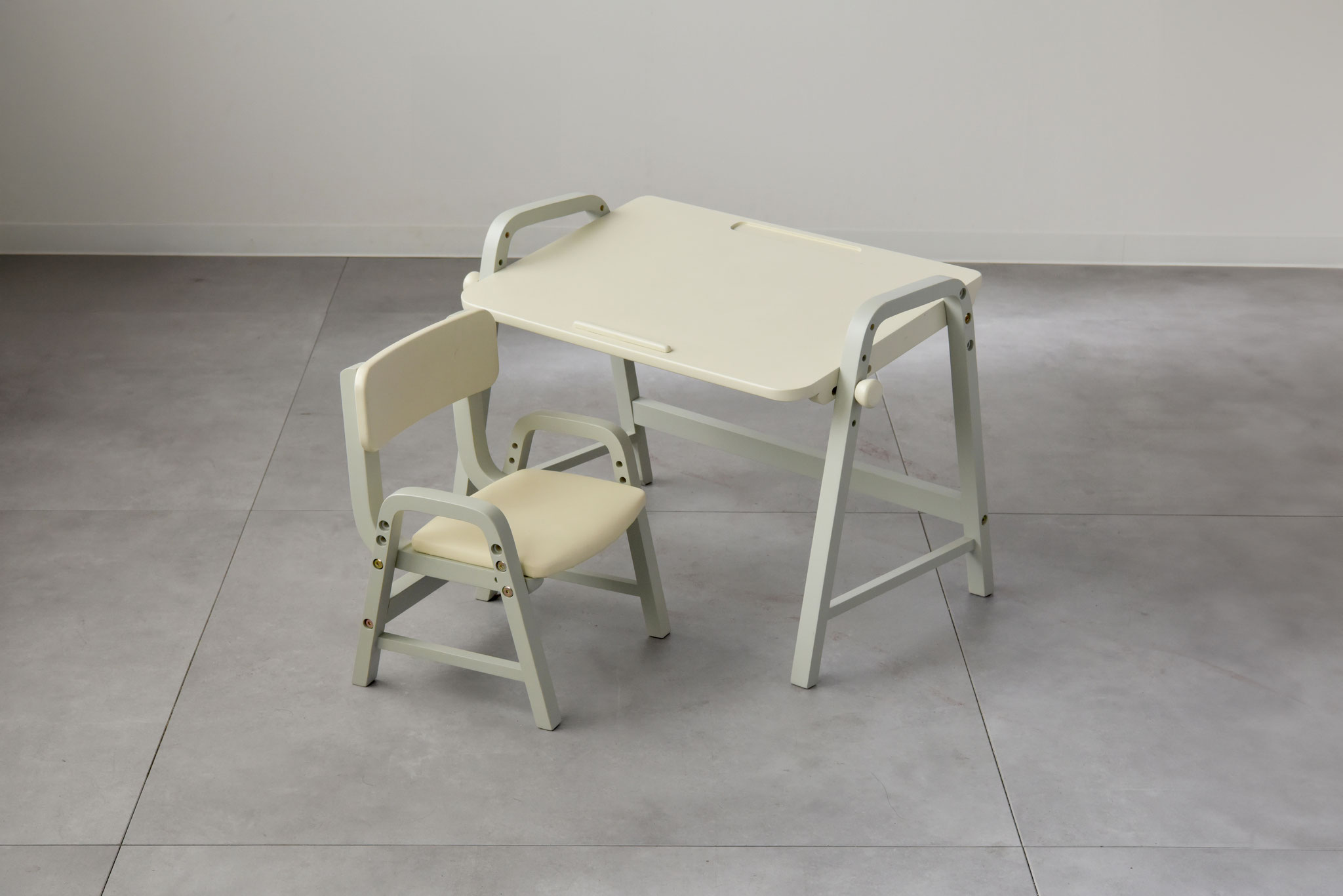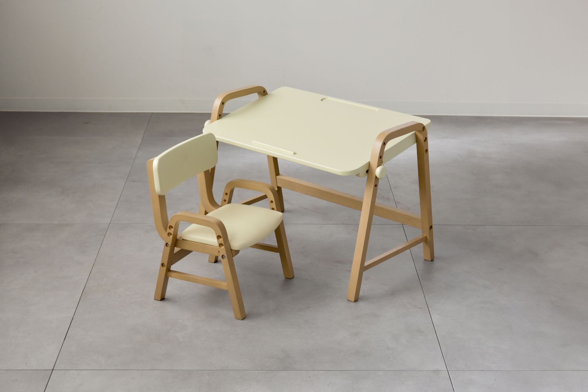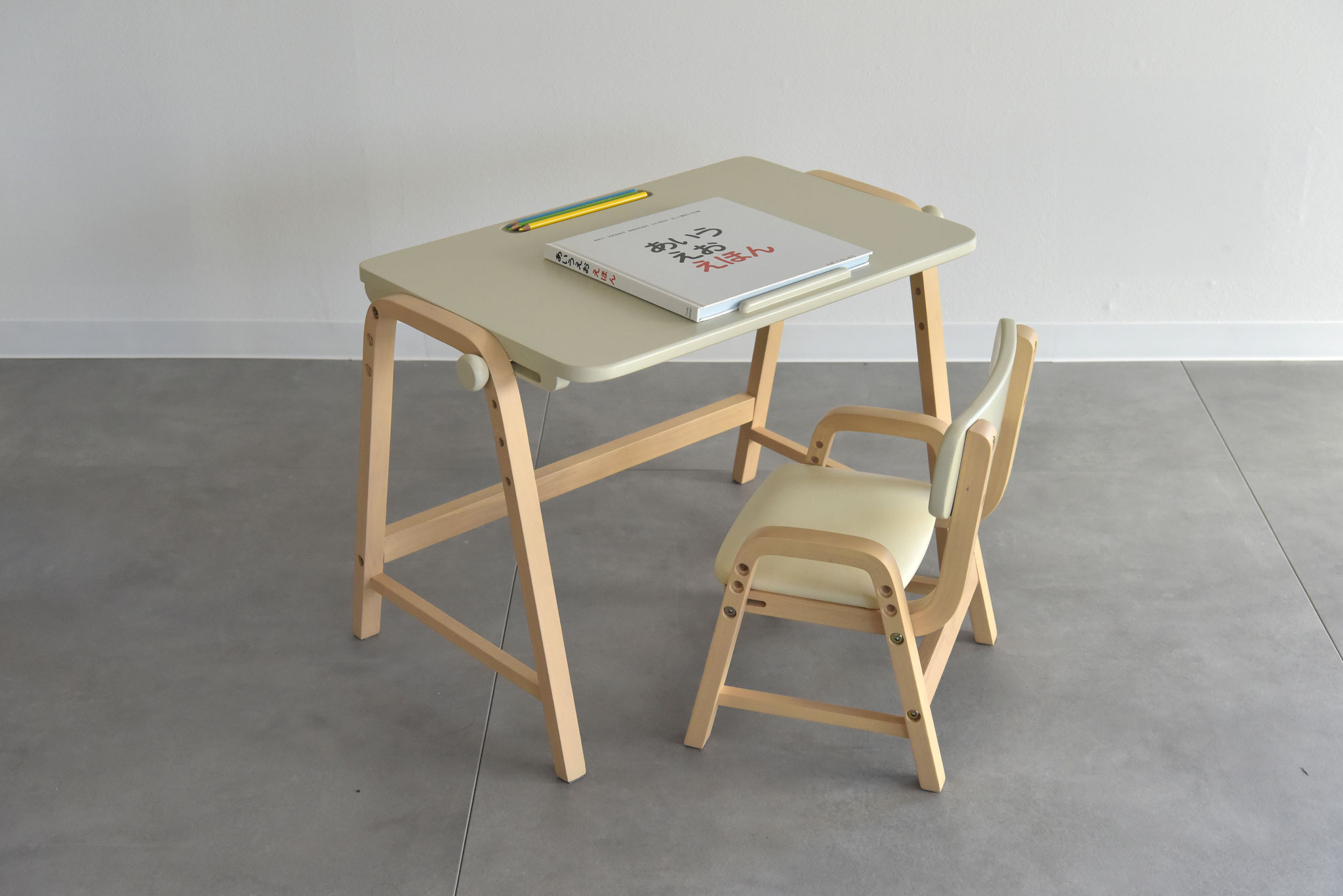 角度調整機能付きのデスクとチェアがセットになったお子様用デスクセット。椅子の高さは3段階で調節が可能なので、お子様の成長に合わせてお使いいただけます。小さなお子さんのリビング学習の学習家具にお使いいただける子供家具です。