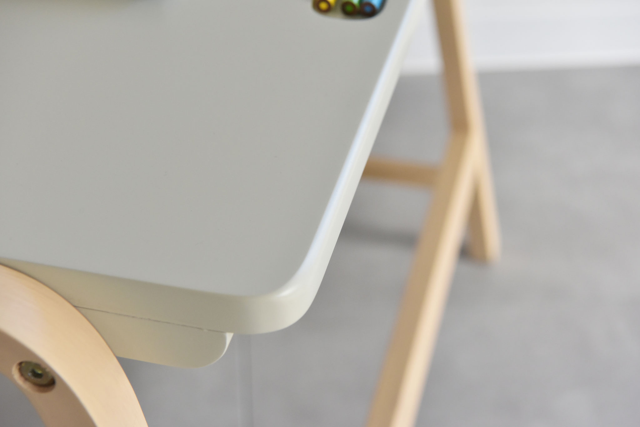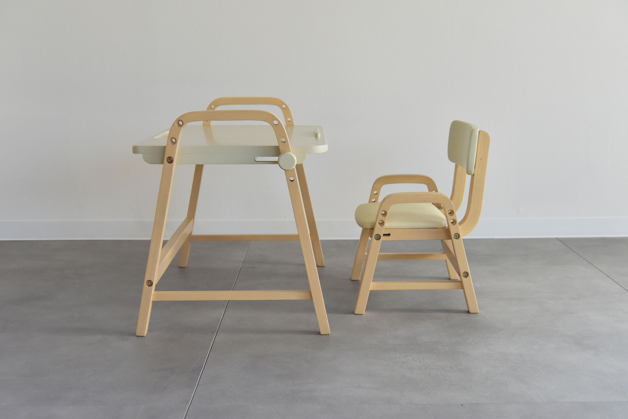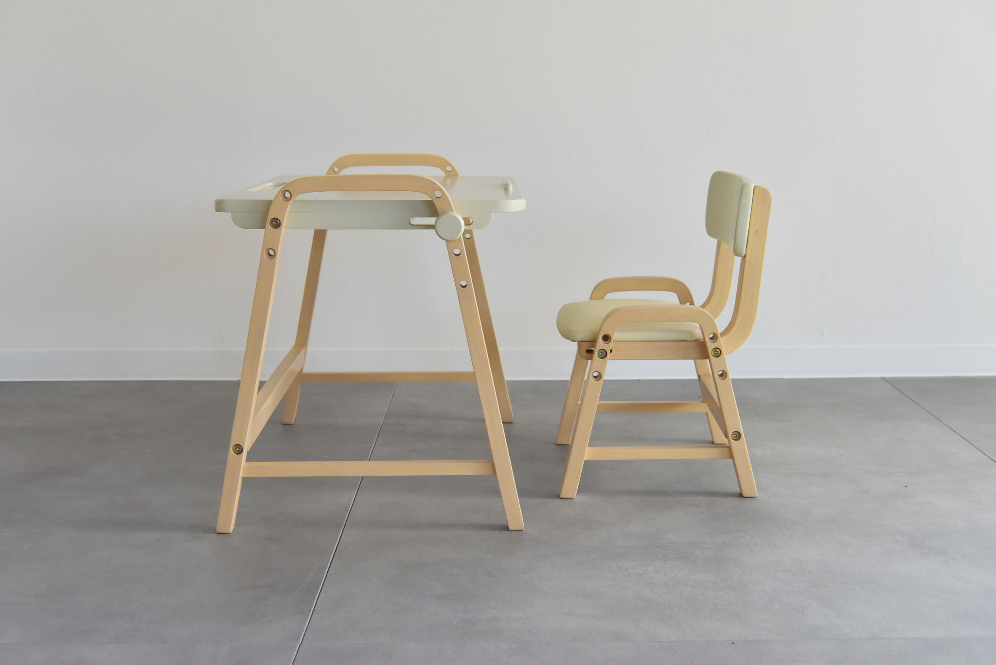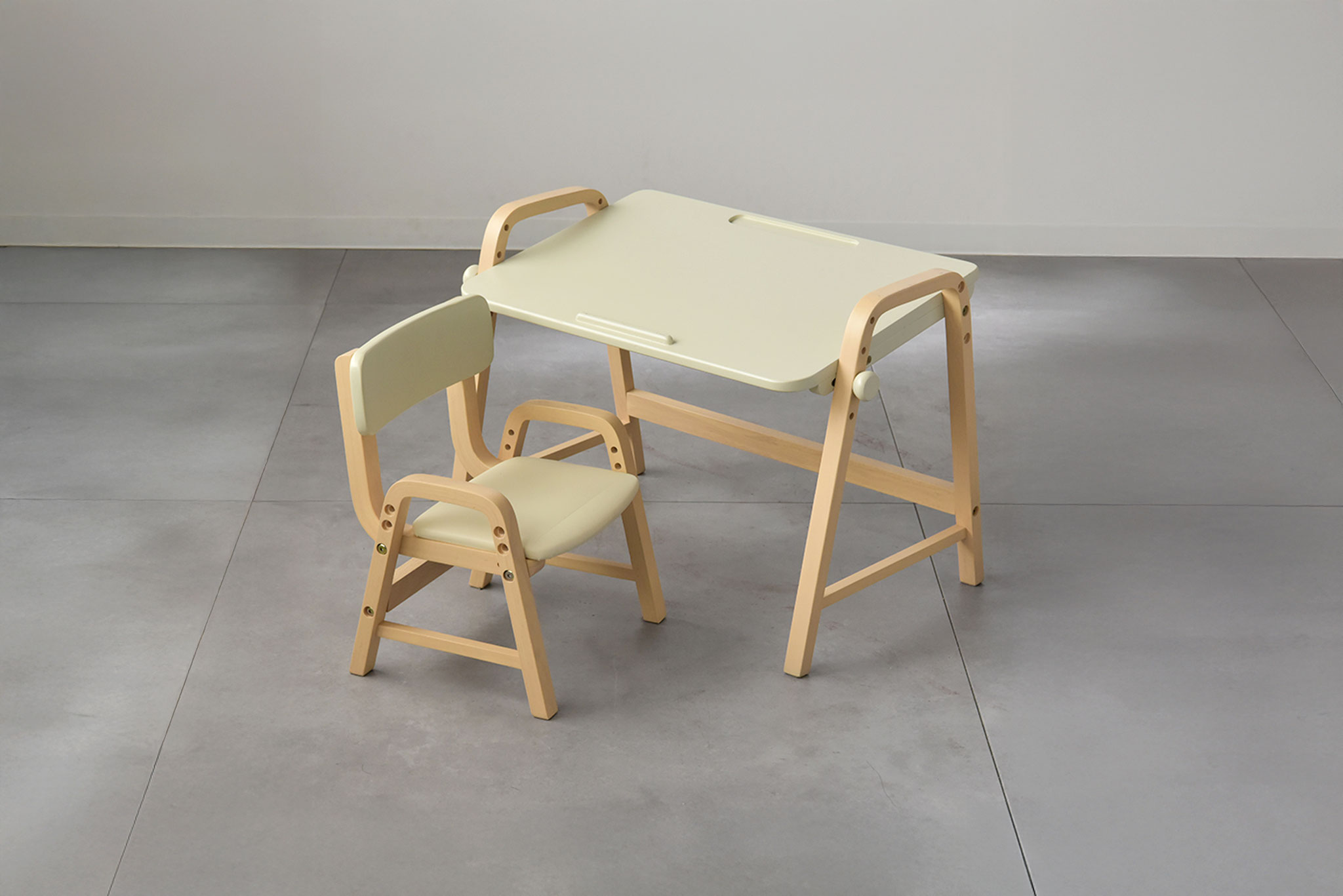 角度調整機能付きのデスクとチェアがセットになったお子様用デスクセット。椅子の高さは3段階で調節が可能なので、お子様の成長に合わせてお使いいただけます。小さなお子さんのリビング学習の学習家具にお使いいただける子供家具です。