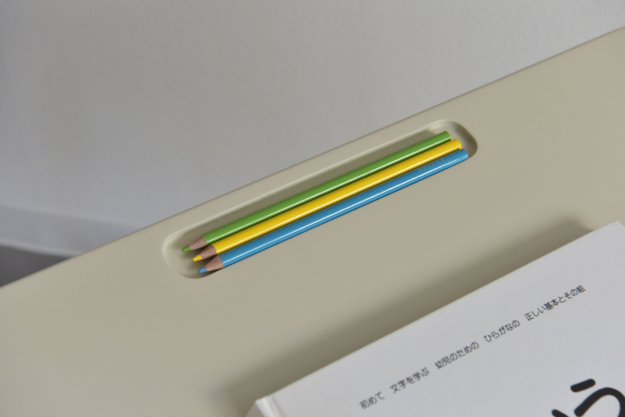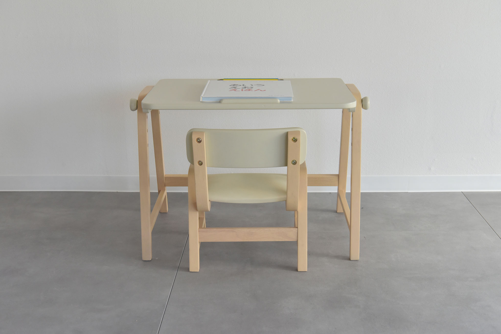 A desk set for children that includes a desk and chair with angle adjustment. The chair height can be adjusted in three stages, so it can be used as your child grows. This is children's furniture that can be used as study furniture for small children to study in the living room.
