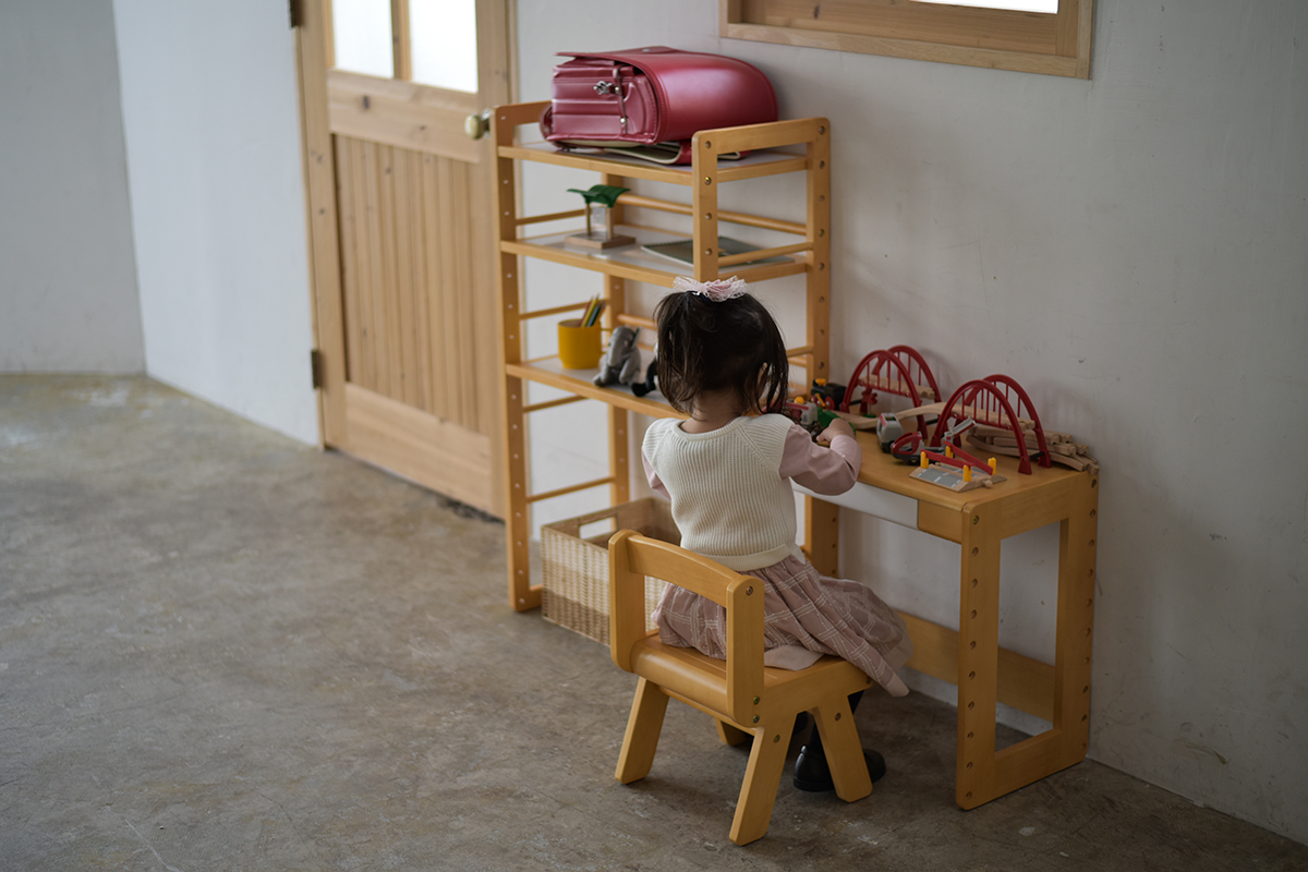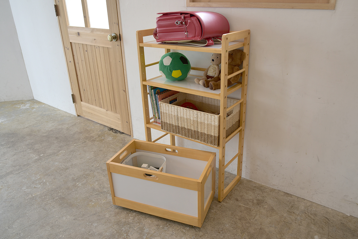 It can be customized flexibly by adding optional shelves to the storage rack with three shelves or by combining toy boxes with casters. It is designed to match well with the KidZoo series study desks, also in terms of the size.